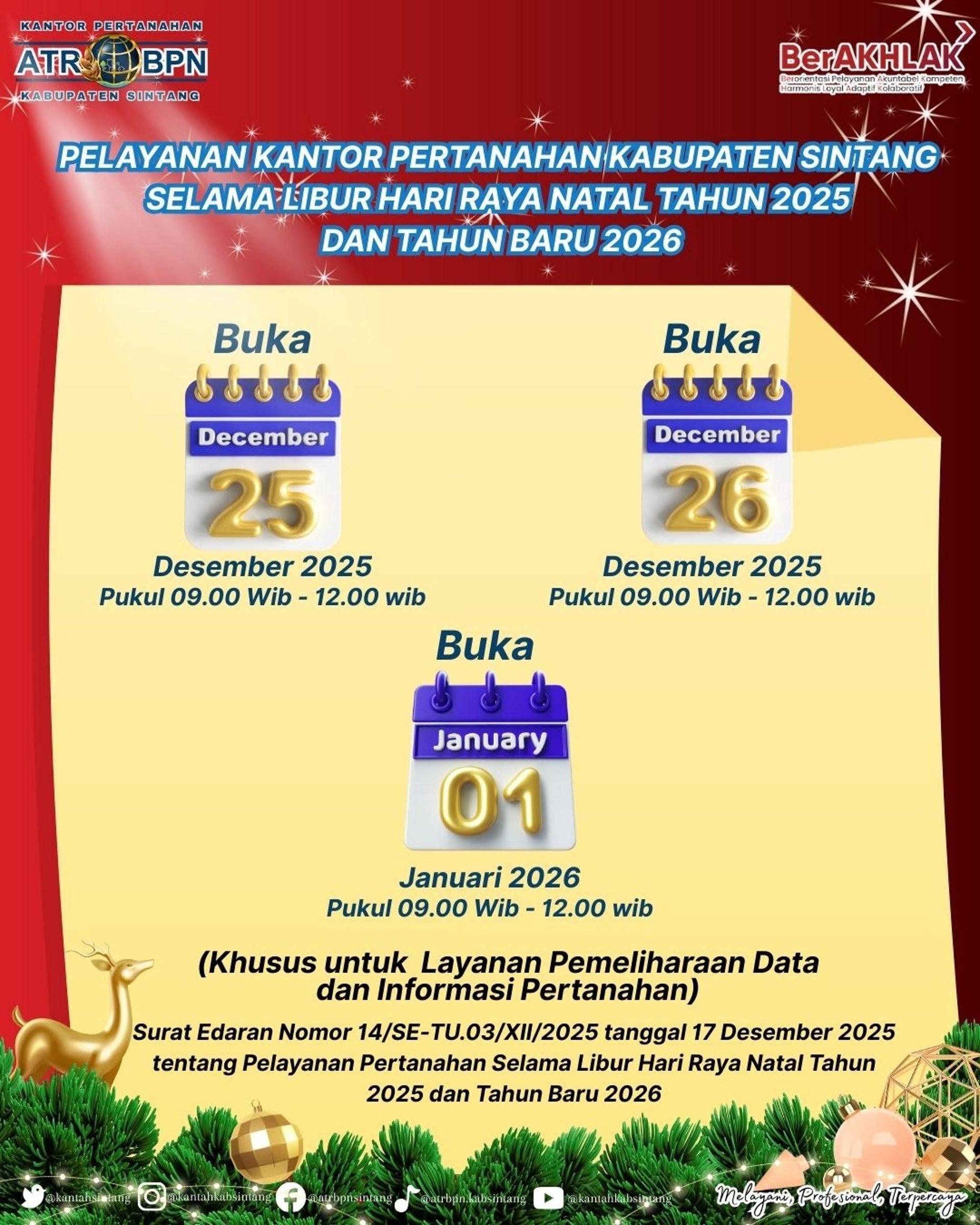 Hallo #SobATRBPN Sehubungan dengan Surat Edaran Nomor 14/SE-TU.03/XII/2025 tanggal 17 Desember 2025 tentang Pelayanan Pertanahan selama libur Hari Raya Natal Tahun 2025 dan Tahun Baru 2026, Pelayanan Kantor Pertanahan Kabupaten Sintang tetap buka tanggal 25 Desember 2025, 26 Desember 2025 dan 01 Januari 2026 pukul 09.00 WIB - 12.00 WIB. Salam Sintang Bersemi ( Bersemangat Melayani Negeri) Ikuti akun media sosial Kantor Pertanahan untuk info terkini. Facebook: @atrbpnsintang Instagram: @kantahkabsintang Twitter: @atrbpnsintang Youtube: ATR/BPN Kab.sintang Untuk Layanan informasi dan pengaduan silahkan hubungi * 0811 1068 0000 (Hotline WA Pengaduan Kementerian) * 0815 2848 6709 (WA Loket Pelayanan Kantor Pertanahan Kabupaten Sintang) #ZonaIntegritas #catur_widha #kantorpertanahankabupatensintang #kantahkabsintang kantahkabsintangBersemi ATRBPNKalbar BPNKalbarHebat ATRBPNKiniLebihBaik ATRBPNMajudanModern MelayaniProfesionalTerpercaya negaRAhadir