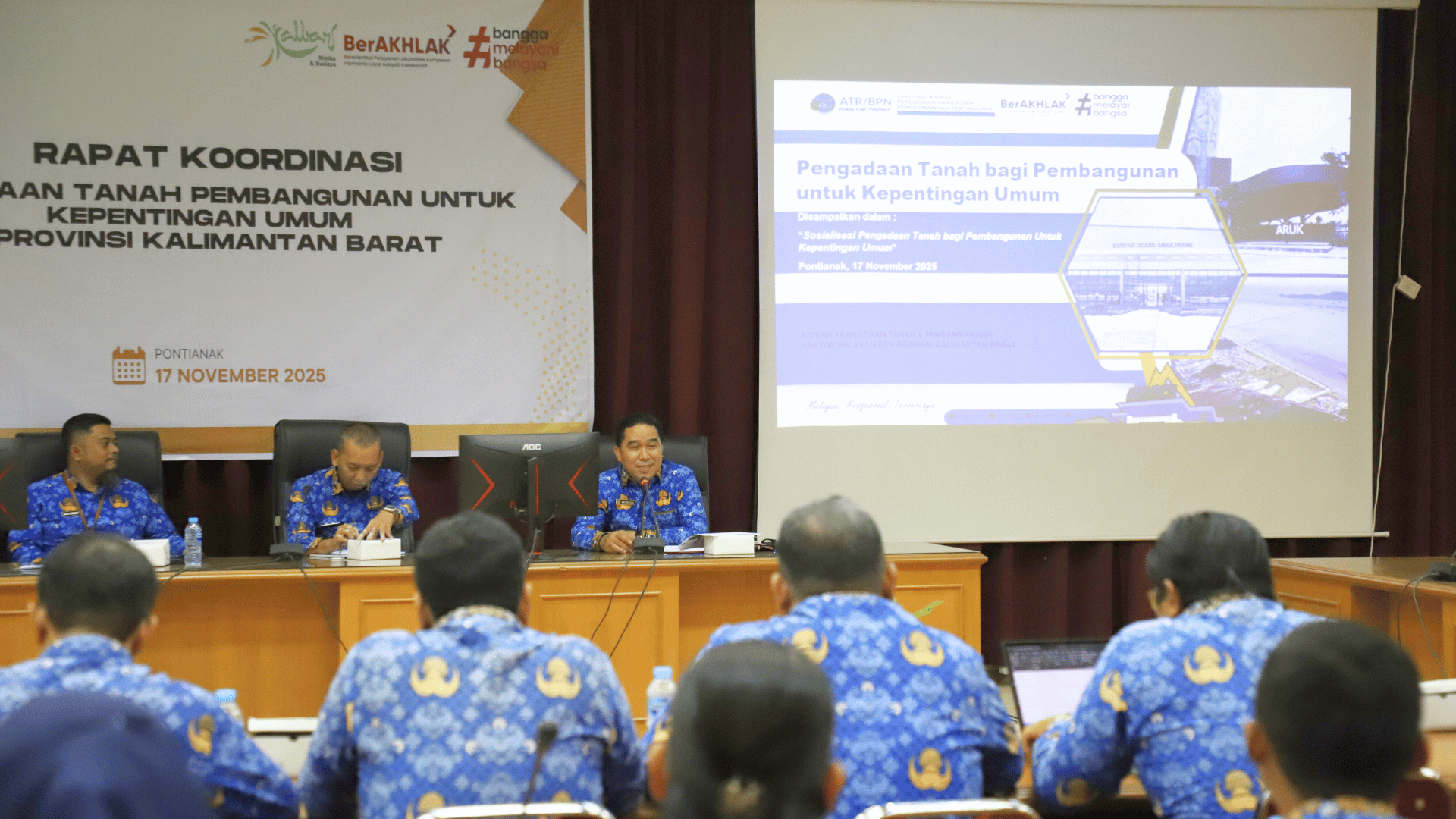 Pontianak - Kantor Wilayah BPN Provinsi Kalimantan Barat turut serta menjadi narasumber dalam kegiatan Rapat Koordinasi Pengadaan Tanah Bagi Pembangunan Untuk Kepentingan Umum yang diselenggarakan Pemerintah Provinsi Kalimantan Barat melalui Dinas Perumahan Rakyat dan Kawasan Permukiman pada Senin, 17 November 2025. Hadir dalam kegiatan Kepala Bidang Pengadaan Tanah dan Pengembangan, Antonius, Penata Pertanahan Madya Leo Latumena serta instansi terkait di lingkungan Pemerintah Provinsi Kalimantan Barat. Dalam paparannya, Antonius menjelaskan berbagai aspek penting, mulai dari dasar hukum pengadaan tanah, perencanaan kebutuhan tanah, mekanisme penetapan lokasi hingga pelaksanaan inventarisasi dan identifikasi. Ia juga menekankan pentingnya koordinasi antara pemerintah daerah, perangkat teknis, dan Kantor Pertanahan dalam percepatan proses pengadaan tanah, terutama untuk mendukung proyek pembangunan strategis di Provinsi Kalimantan Barat. Melalui kegiatan ini, Pemerintah Provinsi Kalimantan Barat berupaya memastikan kesiapan seluruh perangkat daerah dalam memahami ketentuan terbaru terkait pengadaan tanah, sehingga proses pembangunan proyek-proyek strategis dapat berjalan optimal dan sesuai ketentuan perundang-undangan. #BPNKalbarHebat #KerjaIkhlasBerkualitasTuntas #ZonaIntegritas #ZI #WBK #ATRBPNKalbar #BPNKalbarHebat #ATRBPNKiniLebihBaik #ATRBPNMajudanModern #MelayaniProfesionalTerpercaya #negaRAhadir • • • • • • Tim Strategi Komunikasi dan Hubungan Masyarakat Kantor Wilayah Badan Pertanahan Nasional Provinsi Kalimantan Barat • • • • • • Akun Resmi Kantor Wilayah BPN Provinsi Kalimantan Barat: | Facebook : Kanwil BPN Kalbar | Instagram : @KanwilBPNKalbar | X : @KanwilBPNKalbar | Youtube : Kanwil BPN Kalbar